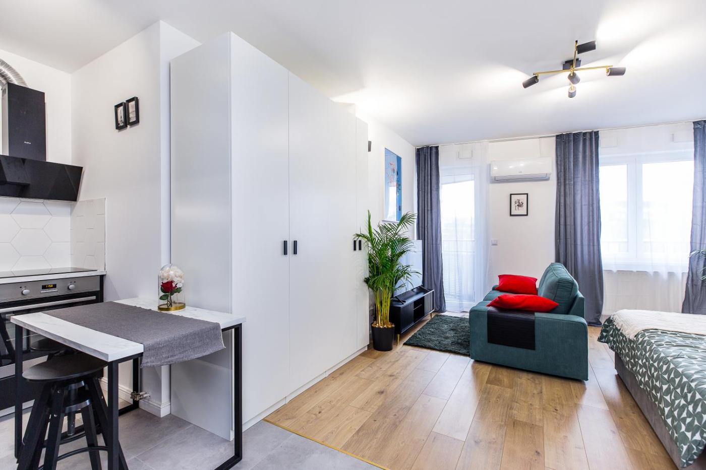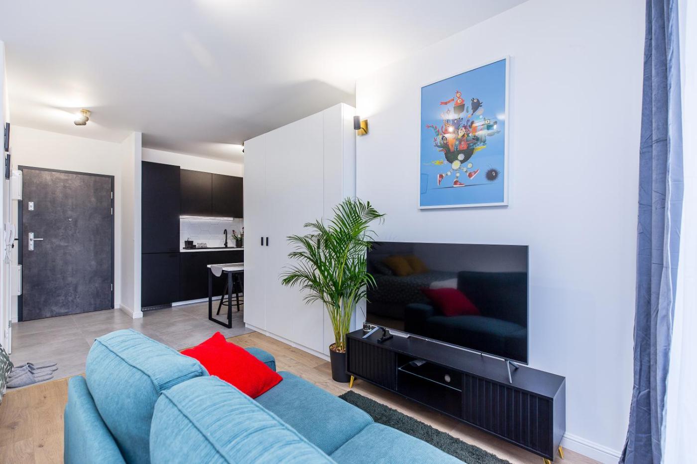 Apartament typu studio. This apartment consists of 1 living room, 1 separate bedroom and 1 bathroom with a shower and free toiletries. The fully equipped kitchen features a refrigerator, a dishwasher, an oven and an electric kettle. The air-conditioned apartment provides a flat-screen TV with streaming services, a washing machine, soundproof walls, a seating area as well as city views. The unit offers 1 bed. Apartament - 2 osobowy. Powierzchnia pokoju ok.: 28 mkw. ;
