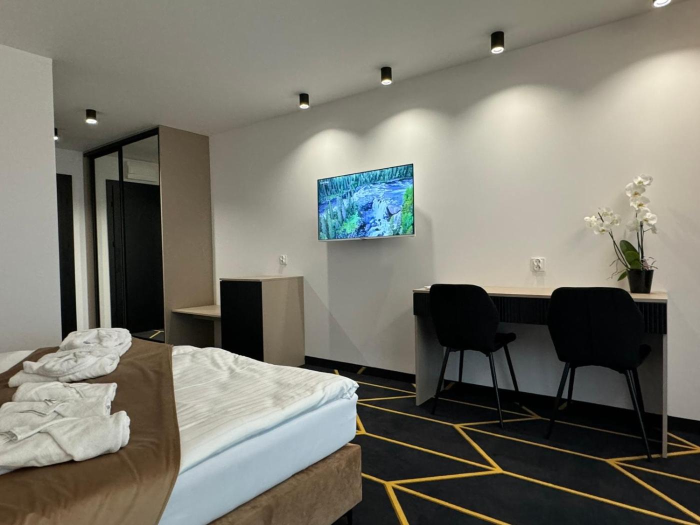 Pokój Czteroosobowy typu Premium. The pool with a view and hot tub are the standout features of this quadruple room. This quadruple room is comprised of a flat-screen TV with streaming services, a private bathroom as well as a terrace with lake views. The unit has 2 beds. Pokój Czteroosobowy - 4 osobowy. Powierzchnia pokoju ok.: 40 mkw.