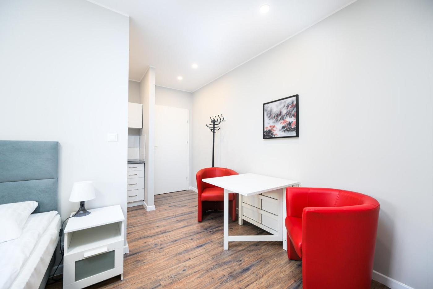 Studio. The studio features a dining area, a wardrobe, as well as a private bathroom boasting a shower and a hairdryer. Guests can make meals in the kitchenette that features a stovetop, a refrigerator, kitchenware and an electric kettle. This studio provides heating, a flat-screen TV and a quiet street view. The unit has 2 beds. Studio - 3 osobowy. Powierzchnia pokoju ok.: 21 mkw.